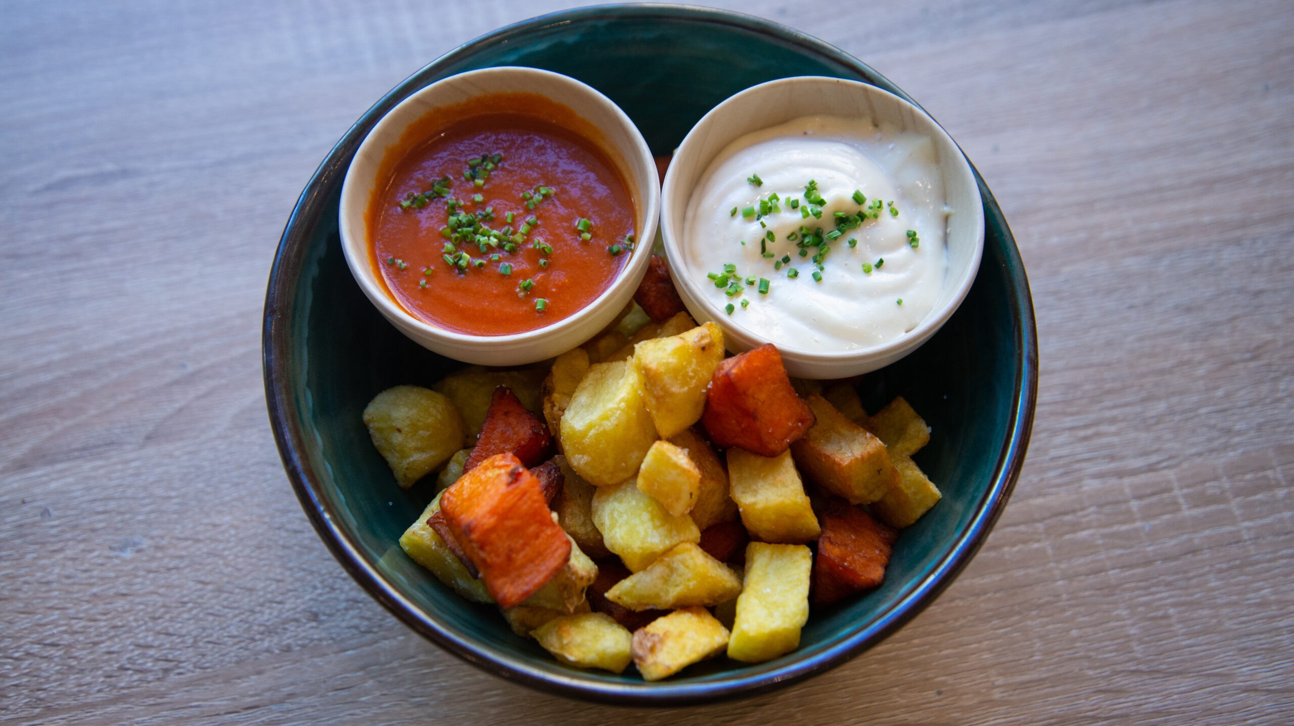 Una montaña de tortillas de maíz caseras acompañadas de queso cheddar fundido, crema agria y guacamole de manzana y menta. Todo eso coronado con una salsa de carne especiada o con su versión veggie de soja texturizada. ![]()